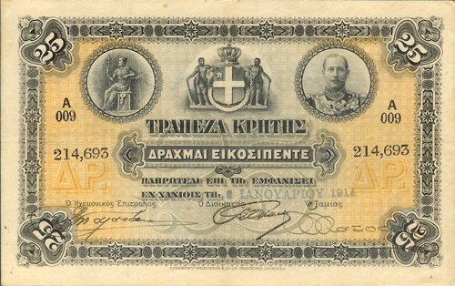 | GREECE | PS-153 | XF, | 8-1-1914, 25 DRACHMAI, KGV, BLACK ON ORANGE, | 500 |