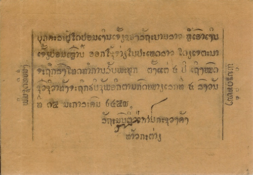 The Lao?s Democratic Republic, located on the Indo-Chinese Peninsula between the Socialist Republic of Vietnam and the Kingdom of Thailand, has an area of 91,429 sq. mi. (236,800 sq. km.) and a population of 5.69 million. Capital: Vientiane. Agriculture employs 95 percent of the people. Tin, lumber and coffee are exported. ,The first United Kingdom of Laos was established in the mid-14th century by King Fa Ngum who ruled an area including present Laos, northeastern Thailand, and the southern part of China?s Yunnan provinces from his capital at Luang Prabang. Thailand and Vietnam obtained control over much of the present Lao territory in the 18th century and remained dominant until France established a protectorate over the area in 1893 and incorporated it into the Union of Indo-China. The Independence of Laos was proclaimed in March of 1945, during the last days of the Japanese occupation of World War II. France reoccupied Laos in 1946, and established it as a constitutional monarchy within the French Union in 1949. In 1953, war erupted between the government and the Pathet Lao, a Communist movement supported by the Vietnamese Communist forces. Peace was declared in 1954 with Laos becoming full independent in 1955 and the Pathet Lao being permitted to occupy two northern provinces. Civil war broke out again in 1960 with the United States supporting the government of the Kingdom of Laos and the North Vietnamese helping the Communist Pathet Lao, and continued, with intervals of truce and political compromise, until the formation of the Lao People?s Democratic Republic on Dec. 2, 1975.,, Rulers:,,, ,Sisavang Vong, 1949-1959,, ,Savang Vatthana, 1959-1975,, Monetary System:,,, ,1 Piastre = 100 Cents to 1955,, ,1 Kip = 100 At, 1955-1978,, ,1 new Kip = 100 old Kip, 1979-,,