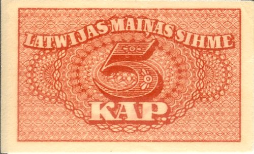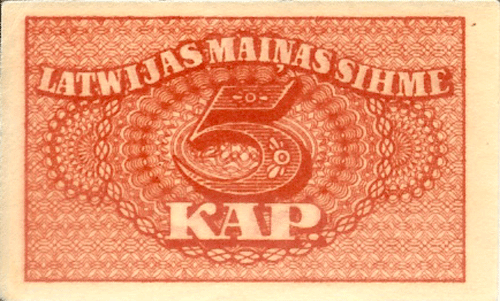 LATVIA P-9 AU, ND, 1920, 5 KAP, RED, VERY TINY NOTE, 15 Front Side Back Side