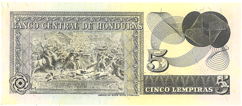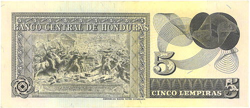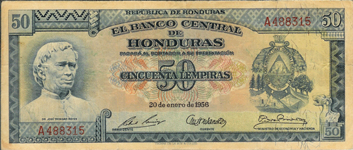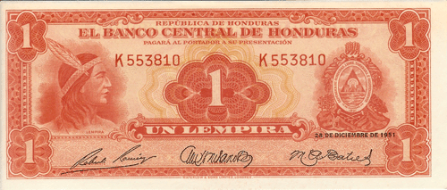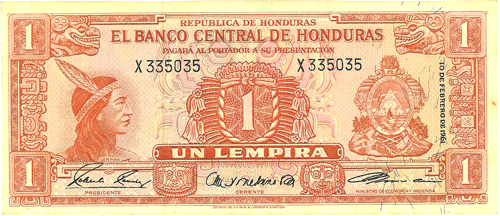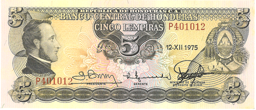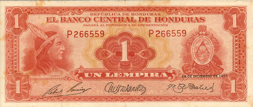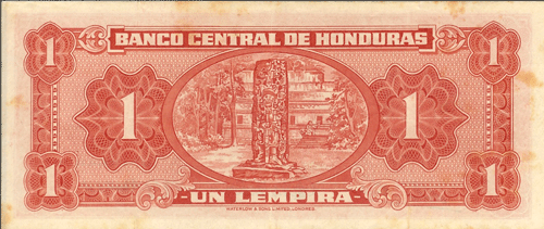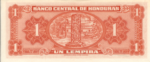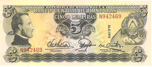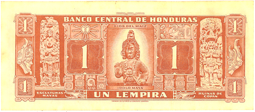 The Republic of Honduras, situated in Central America between El Salvador, Nicaragua and Guatemala, has an area of 43,277 sq. mi. (112,088 sq. km.) and a population of 6.48 million. Capital: Tegucigalpa. Tourism, agriculture, mining (gold and silver), and logging are the chief industries. Bananas, timber and coffee are exported. ,Honduras, a site of the ancient Mayan empire, was claimed for Spain by Columbus in 1502, during his last voyage to the Americas. The first settlement was made by Cristobal de Olid under orders of Henan Cortes, then in Mexico. The area, regarded as one of the most promising sources of gold and silver in the New World, was a part of the Captaincy General of Guatemala throughout the colonial period. After declaring its independence from Spain in 1821, Honduras fell briefly to the Mexican Empire of Agustin de Iturbide, and then joined the Central American Federation (1823-39). Upon dissolution of the federation, Honduras became an independent republic.,, Monetary System:,,, ,1 Peso = 100 Centavos, 1871-1926,, ,1 Lempira = 100 Centavos, 1926-,,