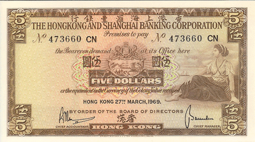 HONG KONG P-181c UNC, 27-3-1969, $5., WOMAN AT RIGHT, BUILDING,' 50 Front Side Back Side