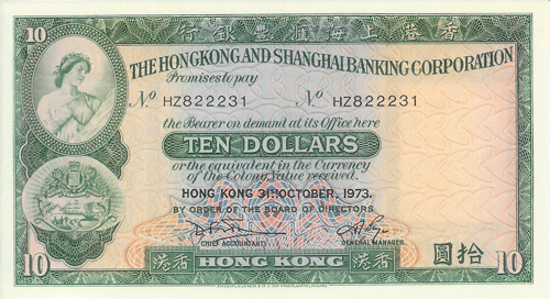 HONG KONG P-182g UNC 31-10-1973, 31-3-1977, ANY DATES $10., GREEN, 25 Front Side Back Side