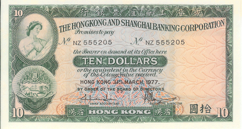 HONG KONG P-182g UNC 31-3-1977, $10., GREEN, WOMAN AT LEFT, 25 Front Side Back Side