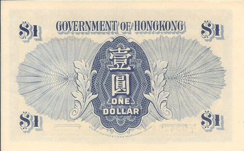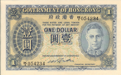 HONG KONG P-316 AU NE, 1940-41, $1., DK BLUE, KGVI AT RIGHT. 395 Front Side Back Side