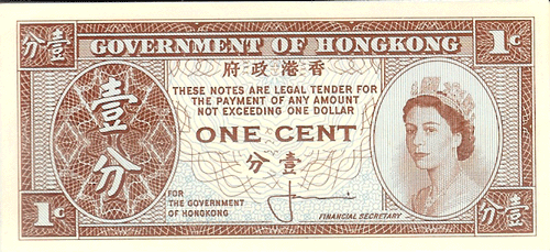HONG KONG P-325a UNC, ND, 1952, 1¢, GEII, BROWN-BLUE, UNIFACE, SMALL NOTE,' 5 Front Side Back Side