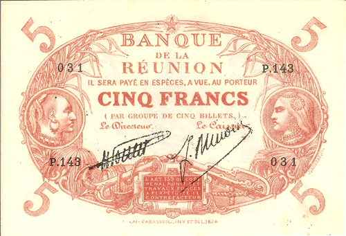 The Department of Reunion, an overseas department of France located in the Indian Ocean 400 miles (640 km.) east of Madagascar, has an area of 969 sq. mi. (2,510 sq. km.) and a population of 556,000. Capital: Saint-Denis. The island?s volcanic soil is extremely fertile. Sugar, vanilla, coffee and rum are exported. ,Although first visited by the Portuguese navigators in the 16th century, Reunion was uninhabited when claimed for France by Capt. Goubert in 1638. It was first colonized as Isle de Bourdon by the French in 1662 as a layover station for ships rounding the Cape of Good Hope to India. It was renamed Reunion in 1793. The island remained in French possession except for the period of 1810-15, when it was occupied by the British. Reunion became an overseas department of France in 1946, and in 1958 voted to continue that status within the new French Union. Banque de France notes were introduced Jan. 1, 1973.,, Rulers:,,, ,French, 1638-1810, 1810-,, ,British, 1810-1815,, Monetary System:,,, ,1 Franc = 100 Centimes,, ,1 Nouveau Franc = 50 Old Francs, 1960,,