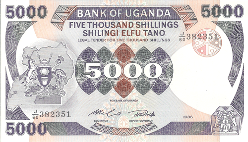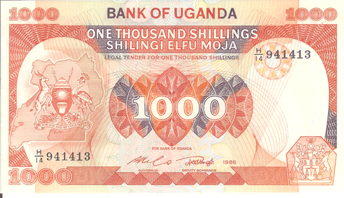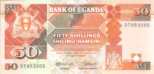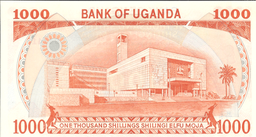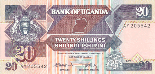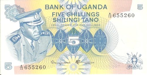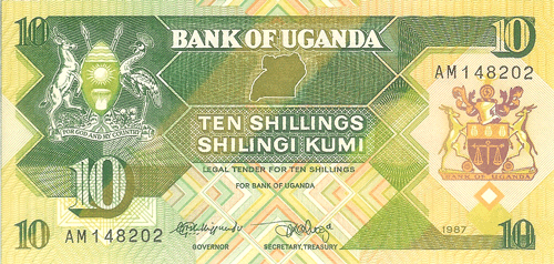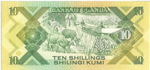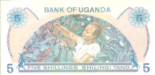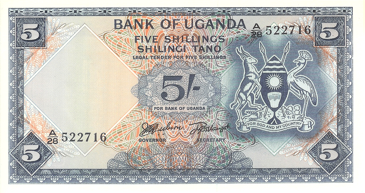 The Republic of Uganda, a former British protectorate located astride the equator in east-central Africa, has an area of 91,134 sq. mi. (236,036 sq. km.) and a population of 15.25 million. Capital: Kampala. Agriculture, including livestock, is the basis of the economy; there is some mining of copper, tin, gold, lead. Coffee, cotton, copper, and tea are exported. ,Uganda was first visited by Arab slavers in 1830s. They were followed in the 1860s by British explorers searching for the headwaters of the Nile. The explorer, and the missionaries who followed them into the Lake Victoria region of south-central Africa in 1877-1879, found well developed African kingdoms dating back several centuries. In 1894 the local native Kingdom of Buganda was established as a British protectorate that was extended in 1896 to encompass an area substantially the same as the present Republic of Uganda. The protectorate was given a ministerial form of government in 1955, full internal self-government on March 1, 1962, and complete independence on October 9, 1962. Uganda is a member of the Commonwealth of Nations. The president is Chief of State and Head of Government.,, ,Notes of East African Currency Board circulated before Bank of Uganda notes were available.,, ,See also East Africa.,, Monetary System:,,, ,1 Shilling = 100 Cents,,