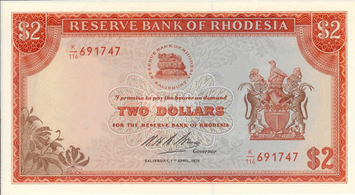 | RHODESIA | P-31K | AU-UNC, | 10-4-1975, $2.,RHODE WATERMARK, SCARCE IN UNCIRCULATED | 350 |