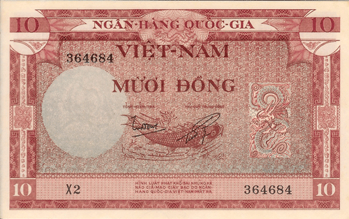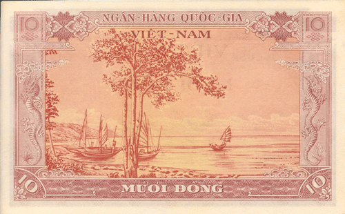 VIETNAM-SOUTH P-3a UNC, ND, 1955, 10 DONG, LAKE & BOATS ON BACK, RED' 15 Front Side Back Side