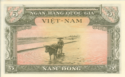 VIETNAM-SOUTH P-2a UNC, ND, 1955, 5 DONG, FARMER, WATER BUFFALO, 8 Front Side Back Side