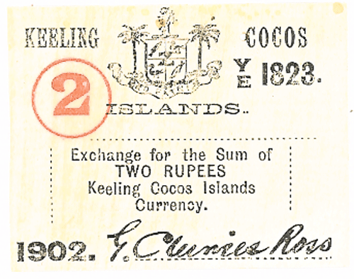 | KEELING COCOS | PS-127 | UNC | ND, 1092, 2 RUPPES, EXCHANGE FOR THE SUM OF TWO RUPPES, SMALL WORM HOLE, RARE. | 200 |