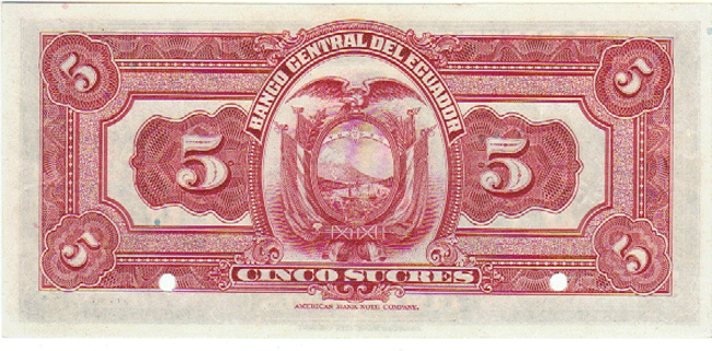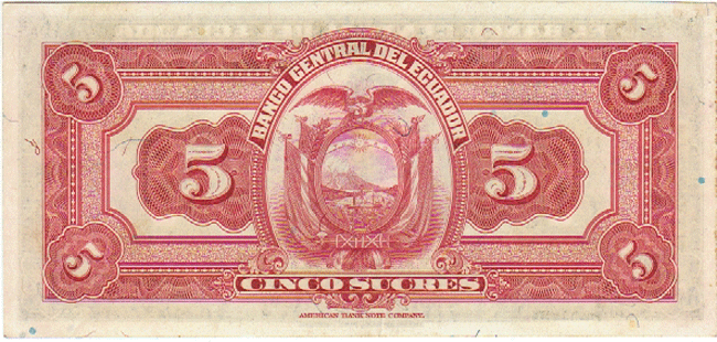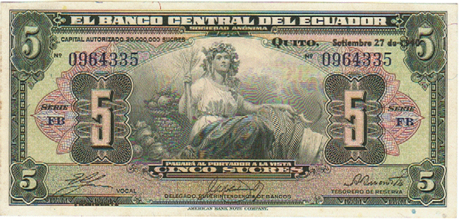ECUADOR P-91a AU 9-27-1940, 5 SUCRES WOMAN SEATED AT CENTER, M/C, 125 Front Side Back Side