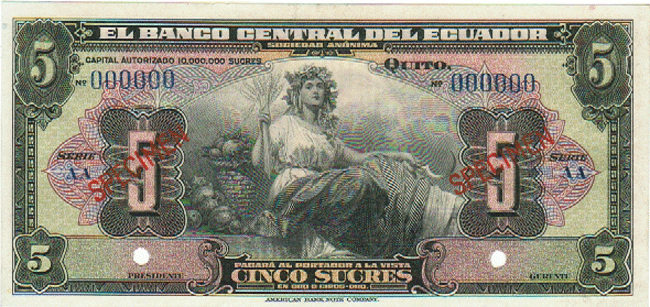 ECUADOR P-91s3 UNC ND, 5 SUCRES ,SPECIMEN, WOMAN SEATED AT CENTER, M/C, 75 Front Side Back Side
