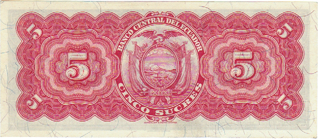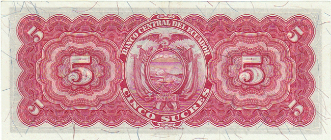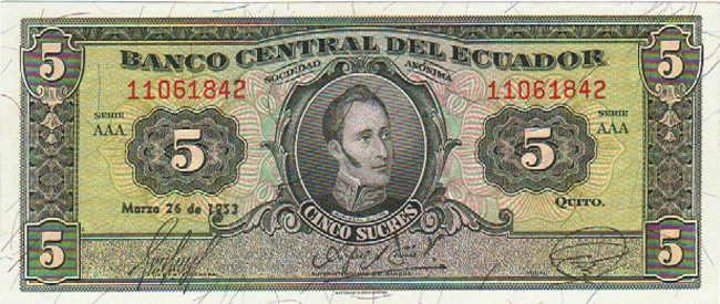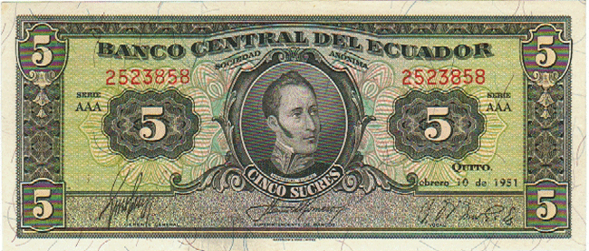 ECUADOR P-98a AU 26-3-1953, 5 SUCRES, MARISCAL SUCRE AT CENTER, 95 Front Side Back Side