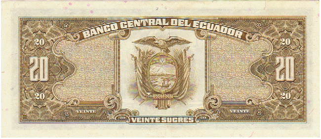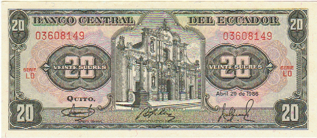 ECUADOR P-121A XF-AU, 29-4-1986, 20 SUCRES, CHURCH BUILDING AT CENTER, 4 Front Side Back Side