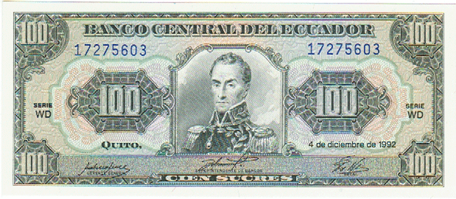 ECUADOR P-123Ab UNC 4-12-1992, 100 SUCRES, BOLIVAR AT CENTER, 4 Front Side Back Side