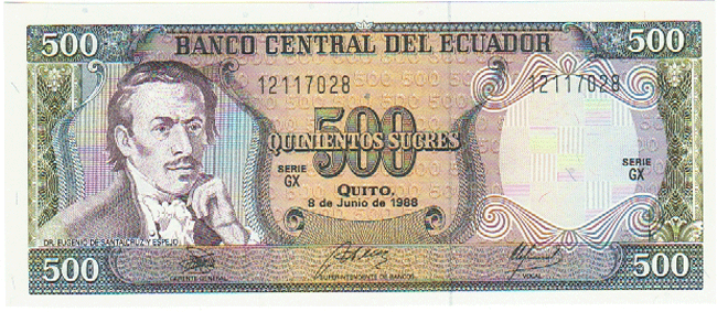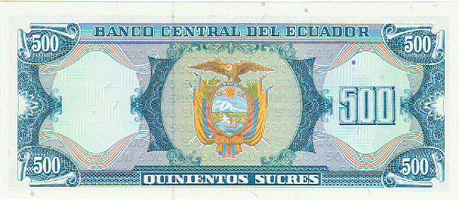 ECUADOR P-124A UNC, 8-7-1988, 500 SUCRES, DATE NOT LISTED, 5 Front Side Back Side