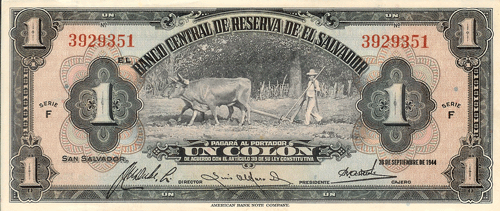 EL SALVADOR P-83 AU 26-9-1944, 1 COLON, COWS AT CENTER, RARE DATE 225 Front Side Back Side