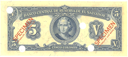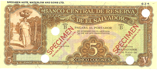 EL SALVADOR P-82 UNC, 10-5-1938, 5 COLONES, WOMAN WITH BASKET, COLUMBUS ON BACK, COLOR TRIAL, WATERLOW & SONS SPECIMEN, 1450 Front Side Back Side