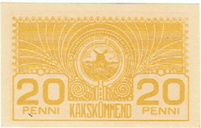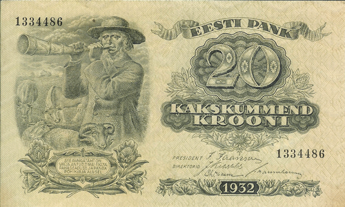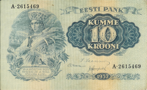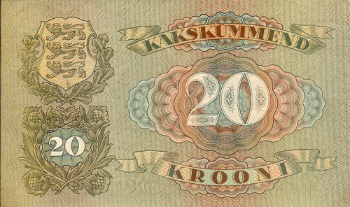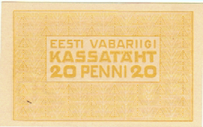 The Republic of Estonia (formally the Estonian Soviet Socialist Republic of the U.S.S.R.) is the northernmost of the three Baltic states in eastern Europe. It has an area of 17,413 sq. mi. (45,100 sq. km.) and a population of 1.42 million. Capital: Tallinn. Agriculture and dairy farming are the principal industries. Butter, eggs, bacon, timber are exported.,, ,This small and ancient Baltic state has enjoyed but two decades of independence since the 13th century. After having been conquered by the Danes, the Livonian Knights, the Teutonic Knights of Germany, the Swedes, the Poles and the Russians. Estonia declared itself an independent republic on Nov.15, 1917. The peace treaty was signed Feb. 2, 1920. Shortly after the start of World War II, it was again occupied by Russia and incorporated as the 16th state of the U.S.S.R. Germany occupied Estonia from 1941 to 1944, after which it was retaken by Russia.,,,, ,On August 20, 1991, the Parliament of the Estonia S.S.R. voted to reassert the republic?s independence.,,,, Monetary System:,,,,,,,, ,1 Mark = 100 Penny to 1928,,,,,,, ,1 Croon = 100 Sent,,,,,,, ,In 1991 the notes of the Russian Northwest Army (Gen. Quench) also circulated ,,in Estonia; in other areas the notes of the Special Corps of the North Army ,,under Gen. Radiance. German reichsmark circulated between 1941-,,,1944
