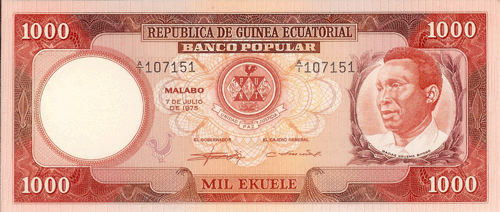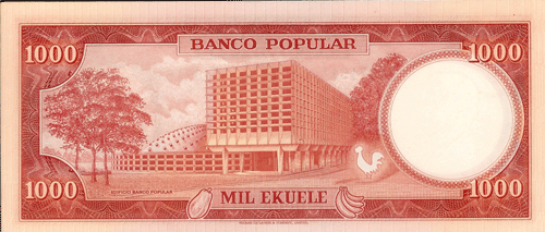 | EQUATORIAL GUINEA | P-8 | UNC, | 7-7-197, 1000 EKUELE, RED, BANK BUIDING, | 15 |