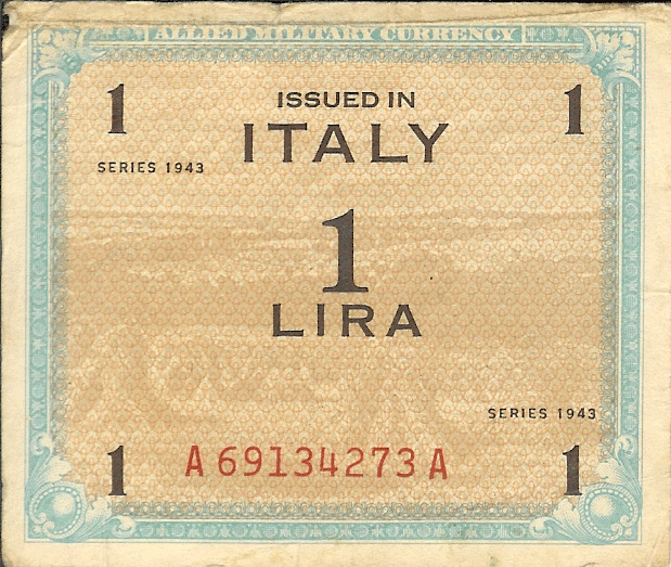 ITALY P-M10a VF+, ND, SERIES 1943, 1 LIRA, BLUE-BROWN, WITH 'F' 2 Front Side Back Side