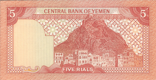 YEMEN ARAB REPUBLIC P-17b UNC ND, 1981, 5 RIALS, RED-ORANGE, CITY VIEW 4 Front Side Back Side