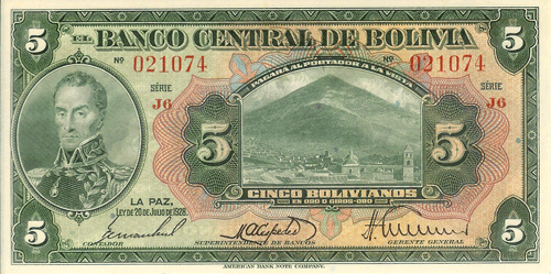 The Republic of Bolivia, a land locked country in west central South America, has an area of 424,165 sq. mi. 1,098,581 sq. km.) and a population of 8.33 million. Capitals: La Paz (administrative); Sucre (constitutional). Mining is the principal industry and tin the most important metal. Minerals, petroleum, natural gas, cotton and coffee are exported. ,The Incas, who ruled one of the world?s greatest dynasties, incorporated the area that is now western Bolivia into their empire about 1200 AD. Their control was maintained until the Spaniards arrived in 1535 and reduced the predominantly Indian population to slavery. When Napoleon occupied Madrid in 1808 and placed his brother Joseph on the Spanish throne, a fervor of revolutionary activity quickened in Bolivia, culminating with the 1809 proclamation of independence. Sixteen years of struggle ensued before the republic, named for the famed liberator General Simon Bolivar, was established on August 6, 1825. Since then, Bolivia has had more than 60 revolutions, 70 presidents and 11 constitutions. ,, Rulers:,,, ,Spanish to 1825,, Monetary System:,,, ,1 Boliviano = 100 (Centavos) to 1965,, ,1 Bolivar = 100 Centavos, 1945-1962,, ,1 Peso Boliviano = 100 Centavos, 1962-1987,, ,1 Boliviano = 100 Centavos, 1987-,,