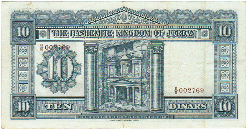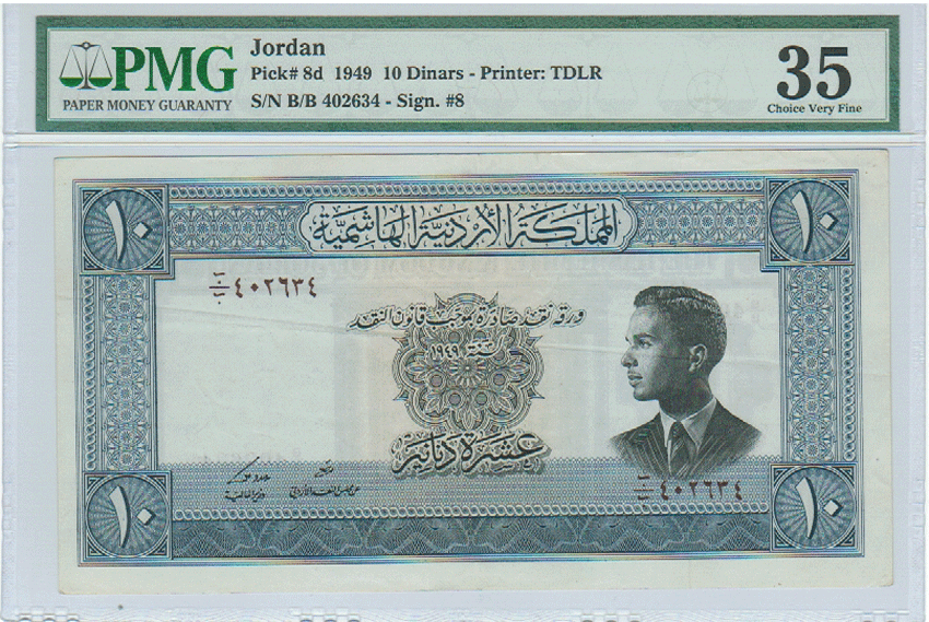 ND, L-1949, 1952, 10 DINARS, KING HUSSIEN, BLUE, BACK, EL HAZNE, PMG 35 |