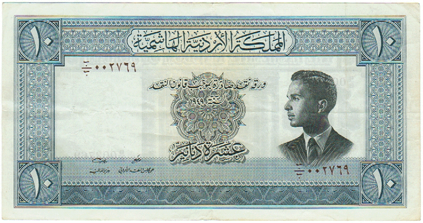 ND, L-1949, 1952, 10 DINARS, KING HUSSEIN, EL HAZNE ON BACK, SIG 5, GREAT NOTE |
